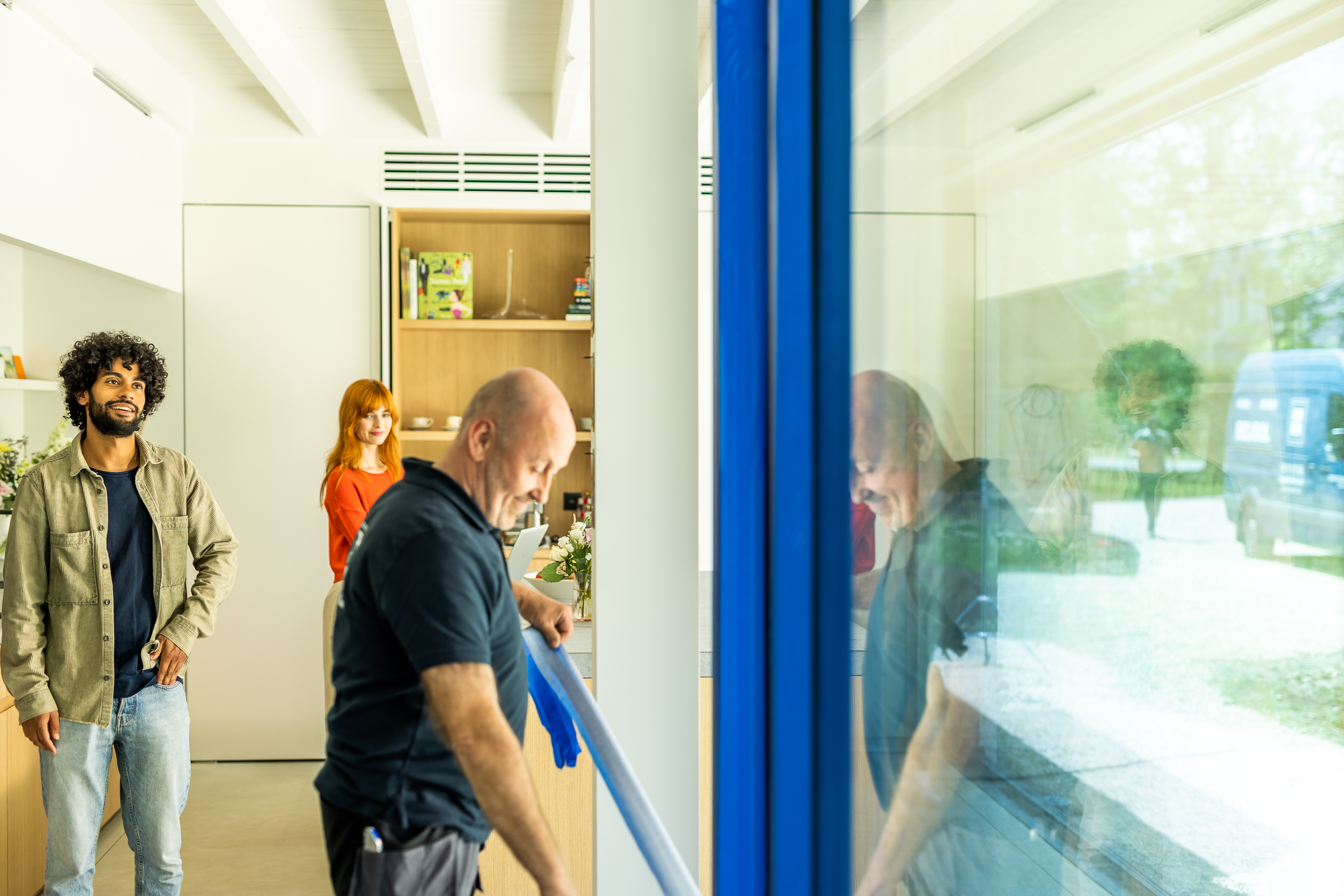 - S’il s’agit d’une rénovation, vos anciens châssis et/ou anciennes portes vont être retirés un(e) à un(e), soigneusement rangés et évacués.
